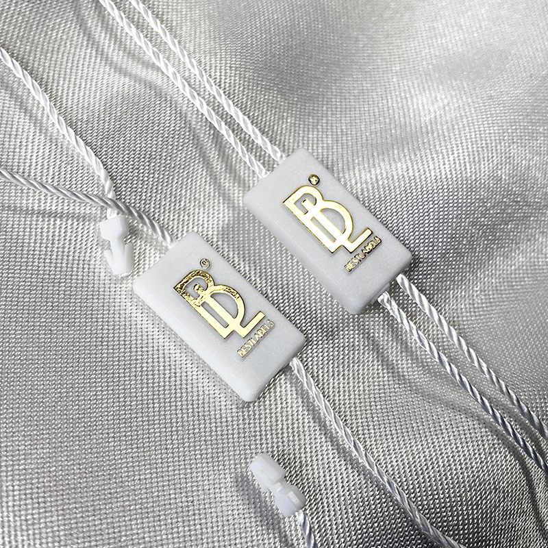 Custom plastic seal tag ST-M182 for fashion products, such as clothes, footwear, bags, jewelry, clothing accessories, etc.