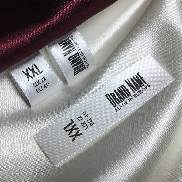 Clothing size label printed on satin, customized with the Brand name or logo on the back side, suitable for clothes. This type of textile label is made using the most advanced technologies in the digital printing field on a textile support. The labels are printed on a special satin by thermal transfer method, with an impressive print quality and high wash resistance.